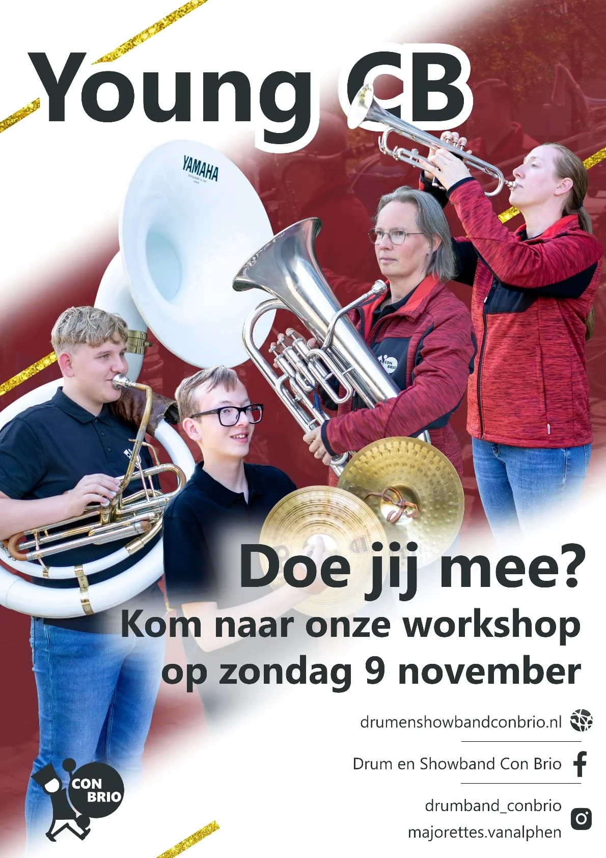 Young CB is hét startende bruisende hart binnen drum- en showband Con Brio, waar muzikanten van alle leeftijden en niveaus elkaar vinden. Of je nu al jaren ervaring hebt op een blaas- of slagwerkinstrument, of juist net begint als leerling of instromer, bij Young CB ben je welkom!