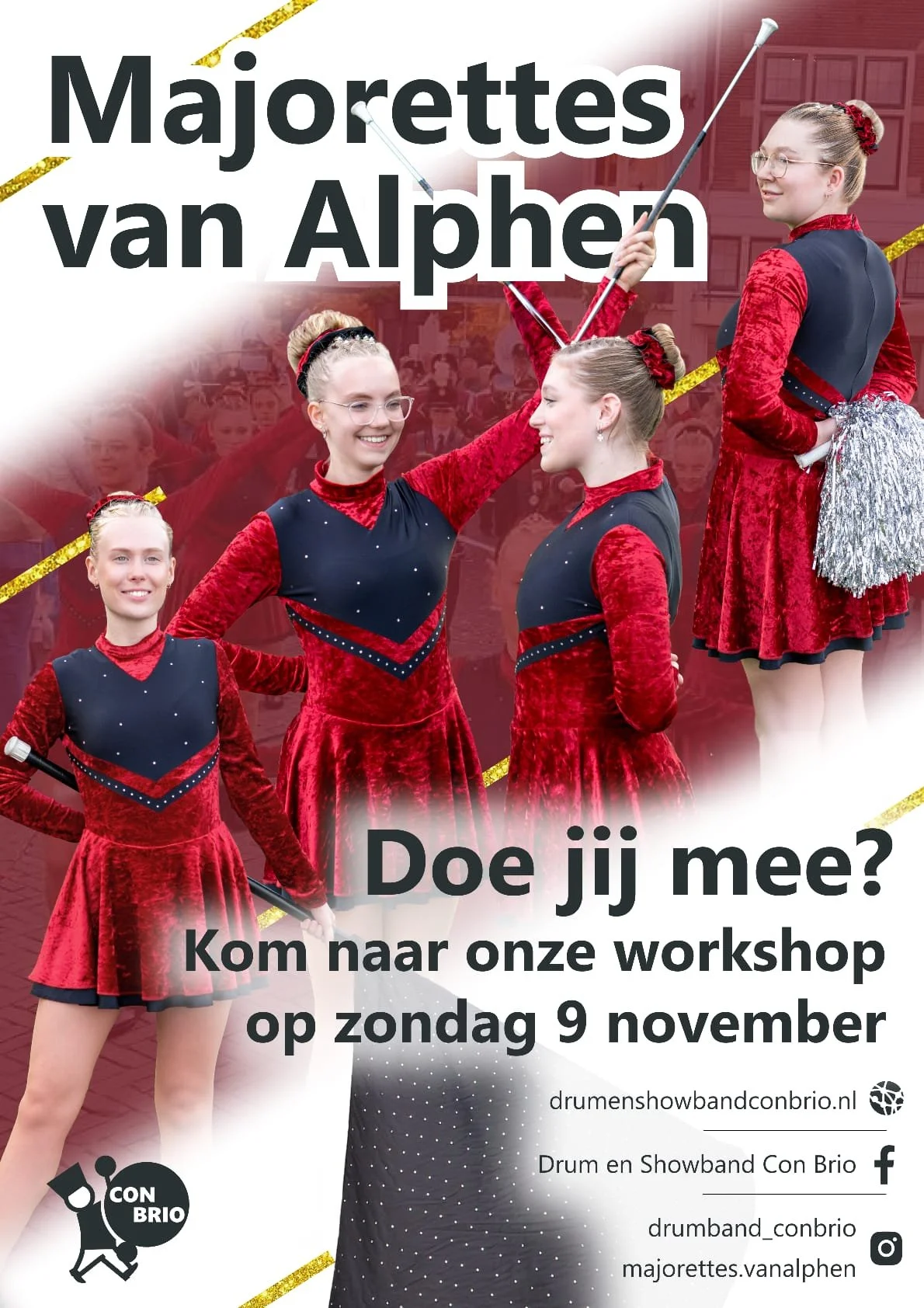 Wil je meer weten? Stuur gerust een mailtje naar info@drumenshowbandconbrio.nl. Geef aan of u informatie wilt over de Drum- en Showband of over de Majorettes van Alphen. Of kom gerust een keer kijken, dat mag altijd! Laat het wel even van tevoren weten in verband met vakanties of speciale lessen.